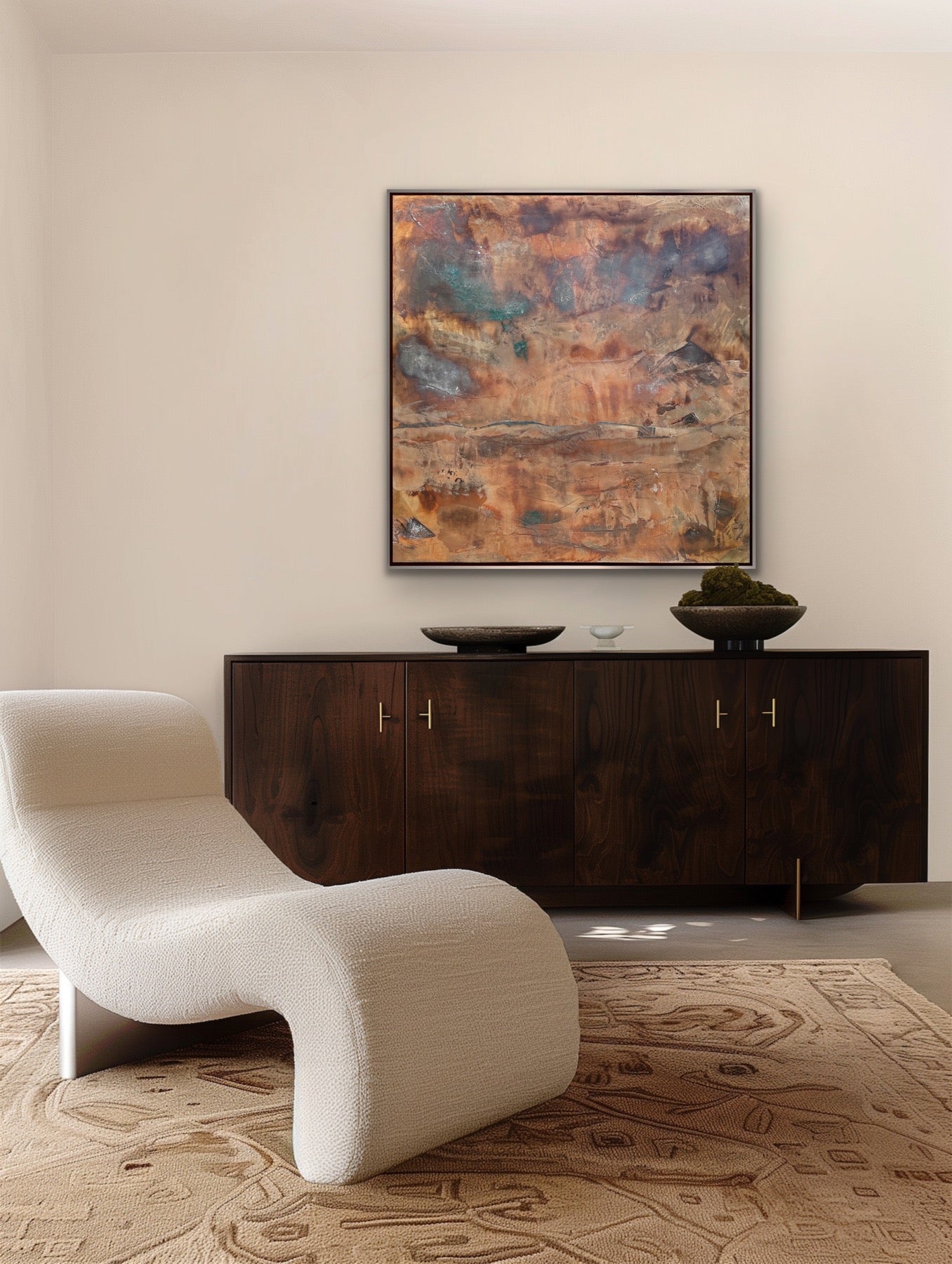“Bella Vista” is an original abstract painting in Venetian plaster on a birch wood panel. It’s mixed with pigments and acrylic paint in layers, some that have been knocked back to reveal the paint beneath. Then it’s burnished, sealed in beeswax and hand polished. It has a beautiful, deep shine similar to marble with slight texture variations in the surface. It measures 36 x 36 x 1.5”d and is framed in a silver leaf finish floating frame measuring 37.5 x 37.5 x 2”d that comes wired and ready to hang.