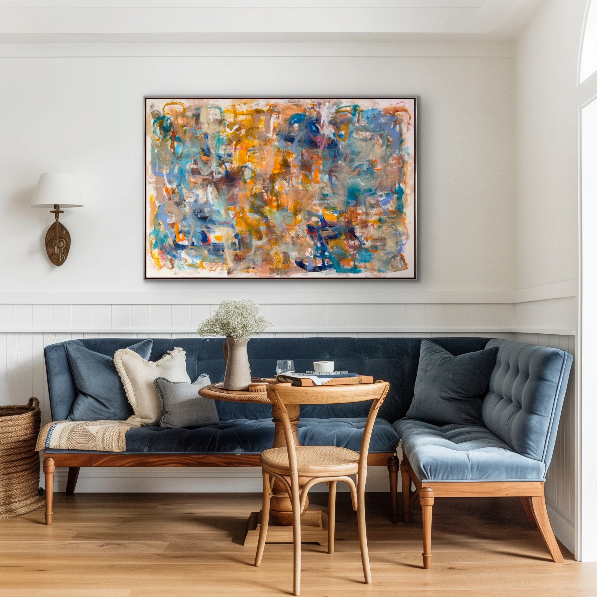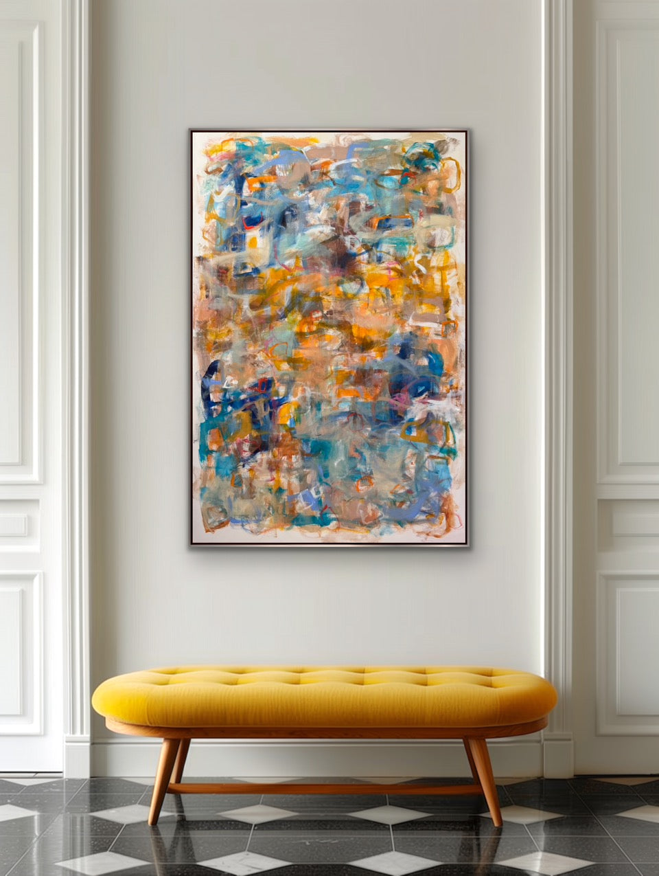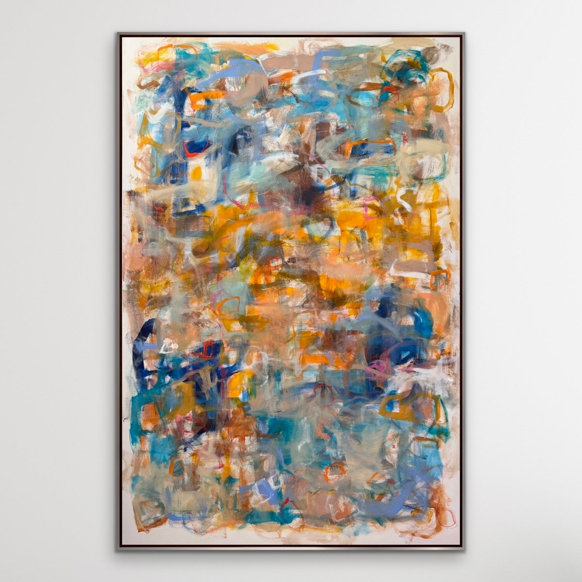 “Bird House” is an original abstract expressionist painting in acrylics, on gallery wrapped canvas. It measures 60 x 40 x 1.5”d. There is an optional silverleaf finish wood floating frame or it can come unframed with the sides painted white. With the frame it measures 41.25 x 61.25 x 2. It can be hung vertically or horizontally.