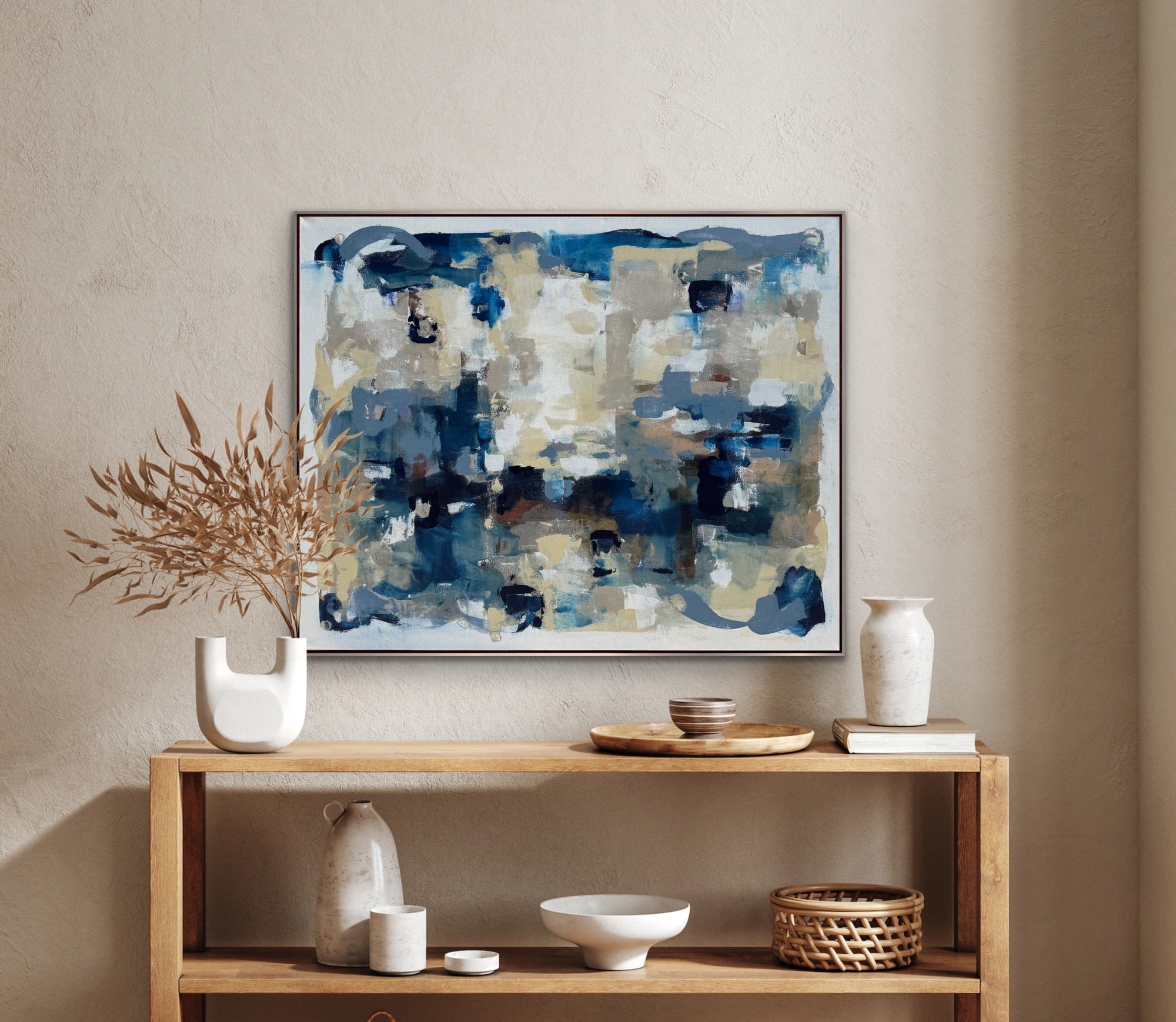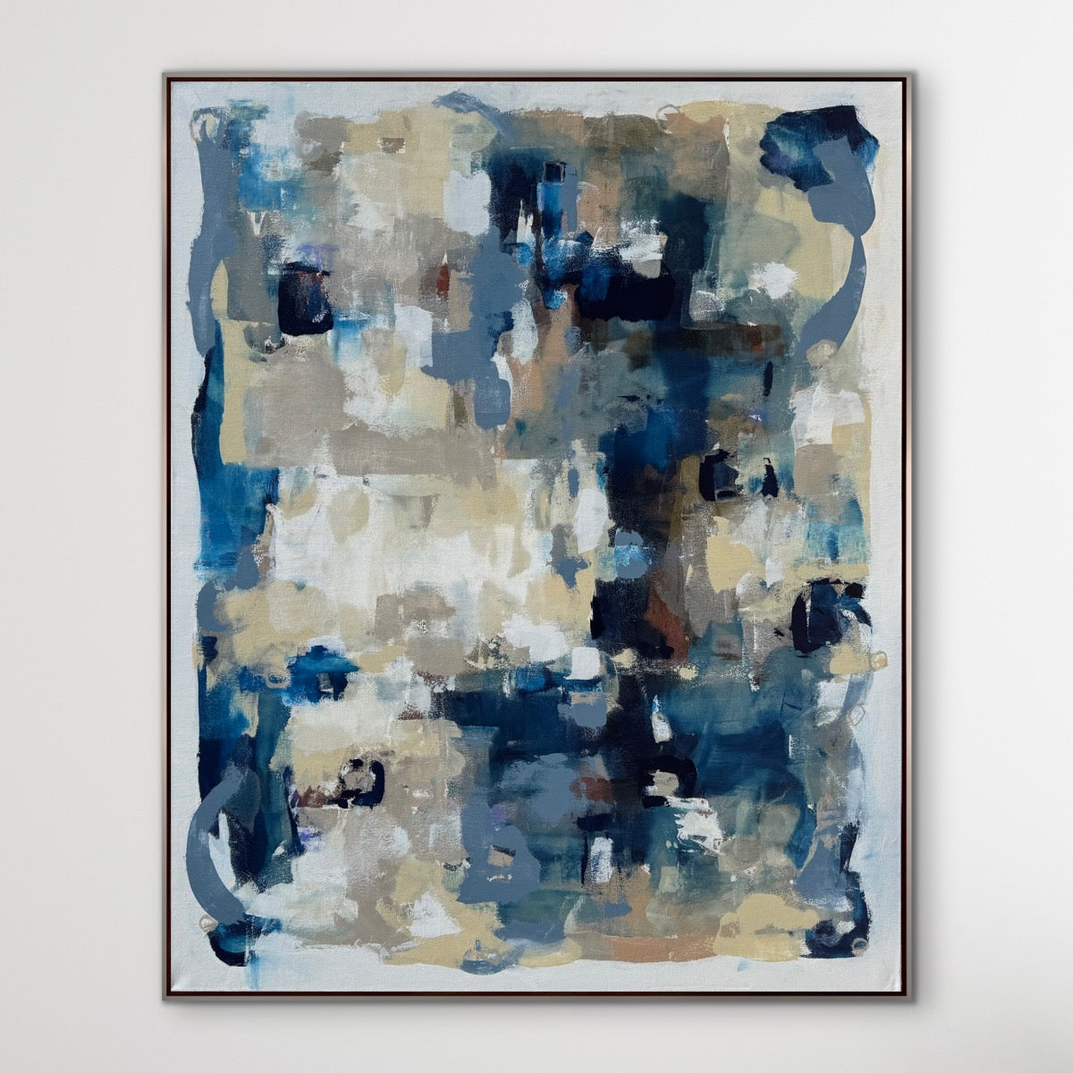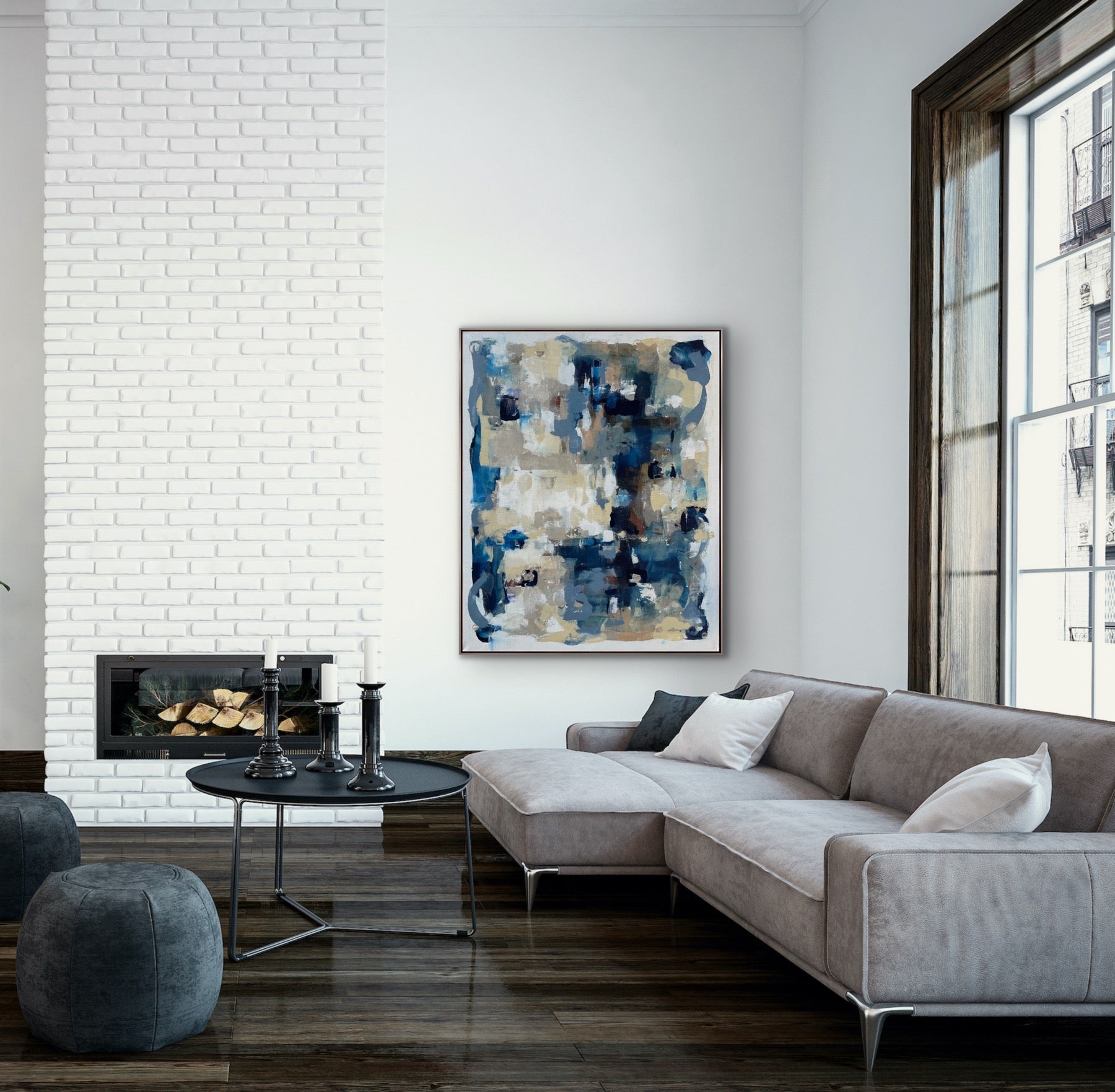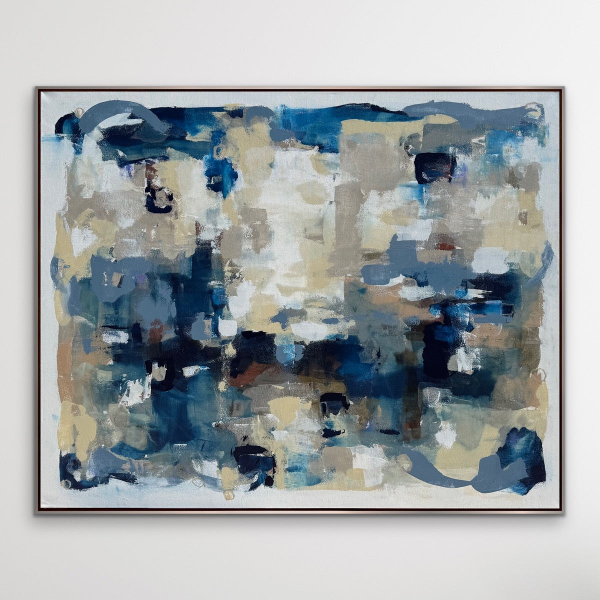 “City Blue “ is an original abstract expressionist painting in acrylics, on gallery wrapped canvas. It measure 48 x 60 x 1.5”d. There is an optional silver leaf finish wood floating frame or it can come unframed with the sides painted white. It can be oriented horizontally or vertically.