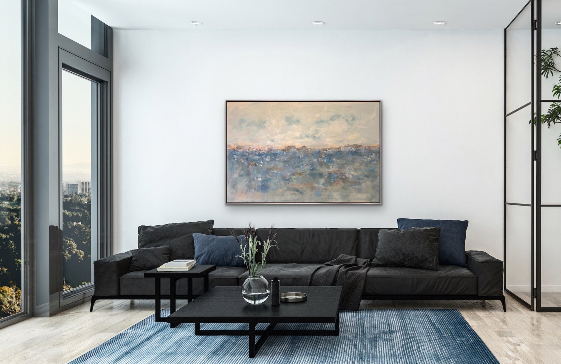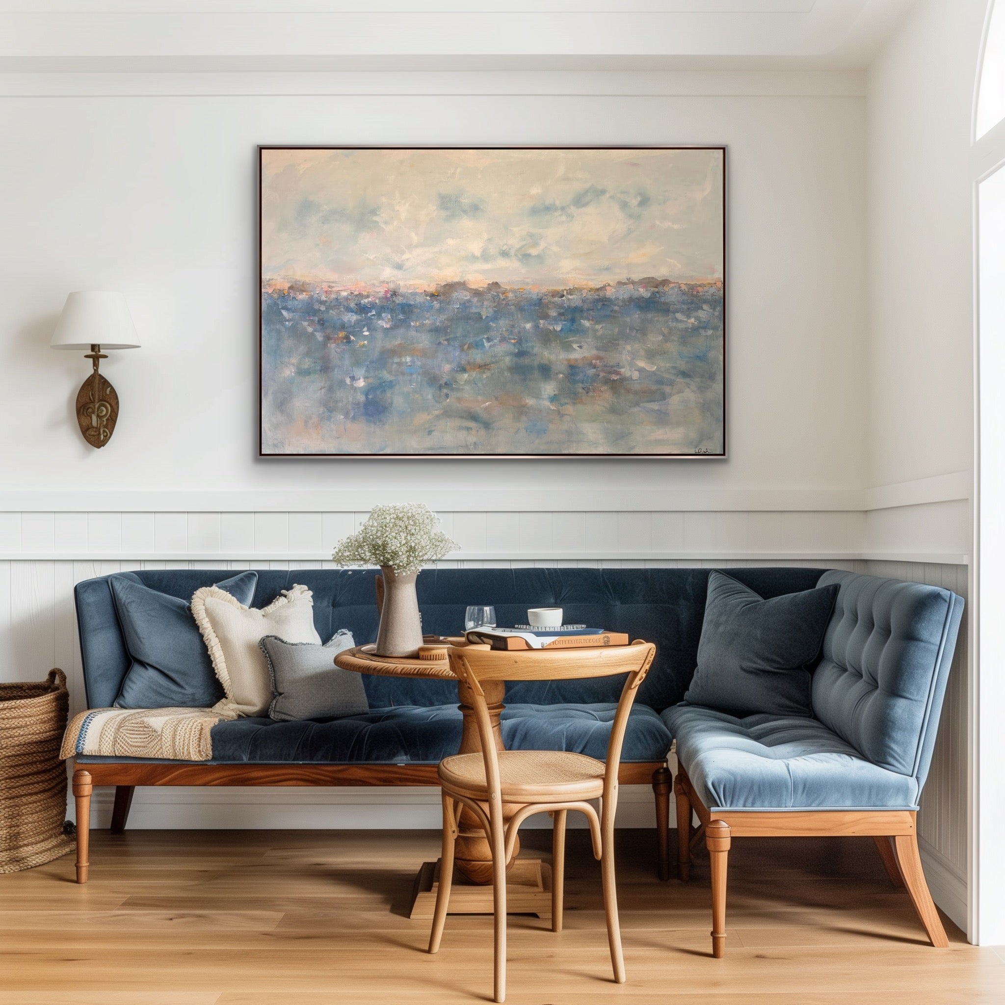 “Dreamy Sea” is an original abstract seascape/landscape painting in acrylics, on gallery wrapped canvas. It measures 60 x 40 x 1.5”d. There is an optional silverleaf finish wood floating frame measuring 61.25 x 41.25 x 2”d or it can come unframed with the sides painted to match the front. .