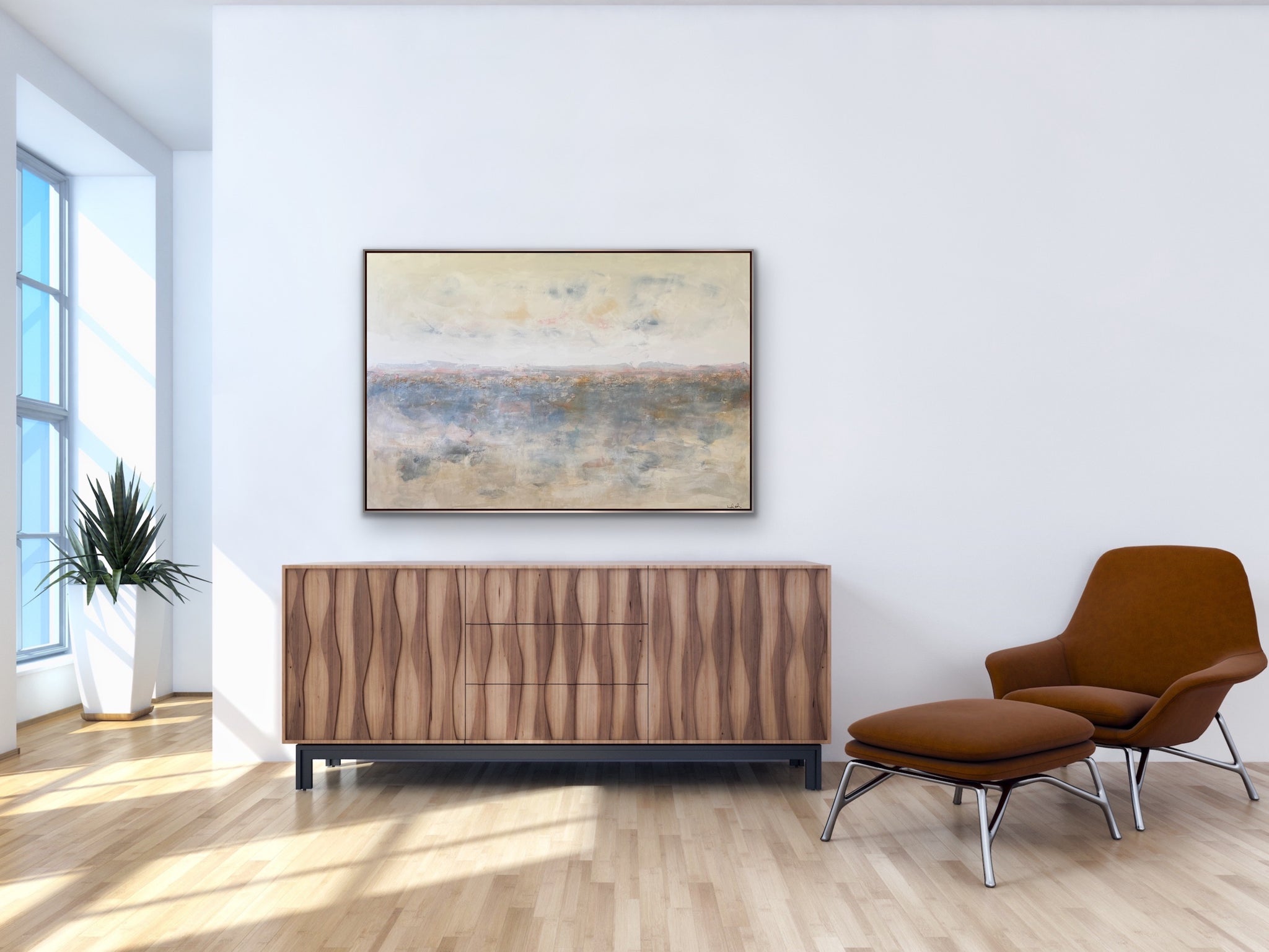 “Evening Calm” is an original abstract seascape/landscape painting in acrylics, on gallery wrapped canvas. It measures 60 x 40 x 1.5”d. There is an optional silverleaf finish wood floating frame measuring 61.25 x 41.25 x 2”d or it can come unframed with the sides painted to match the front. .