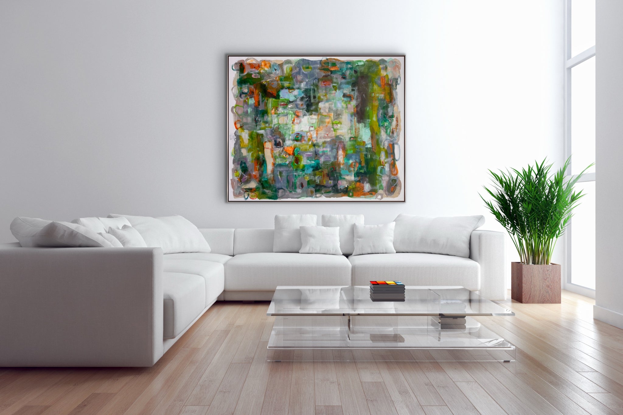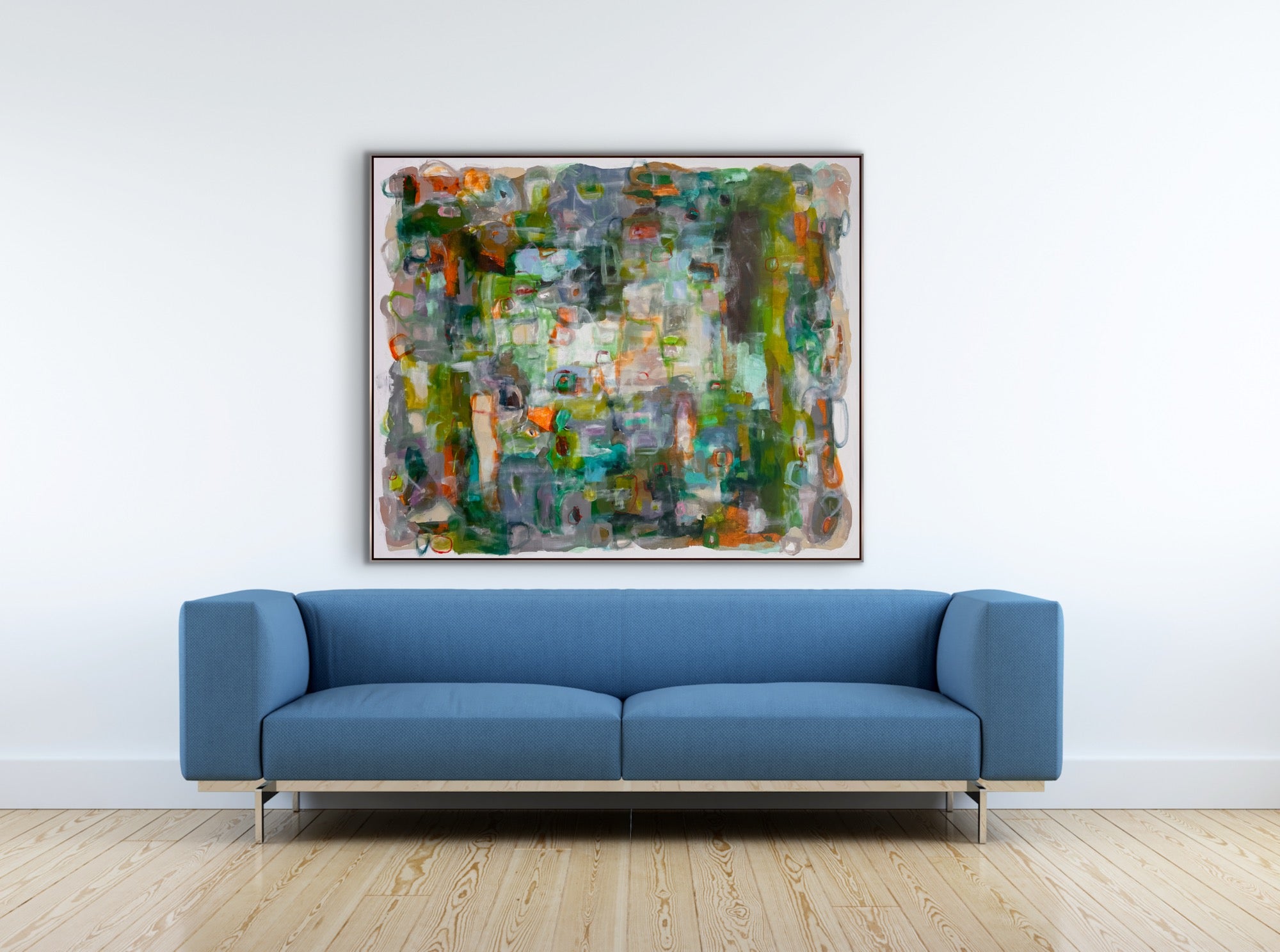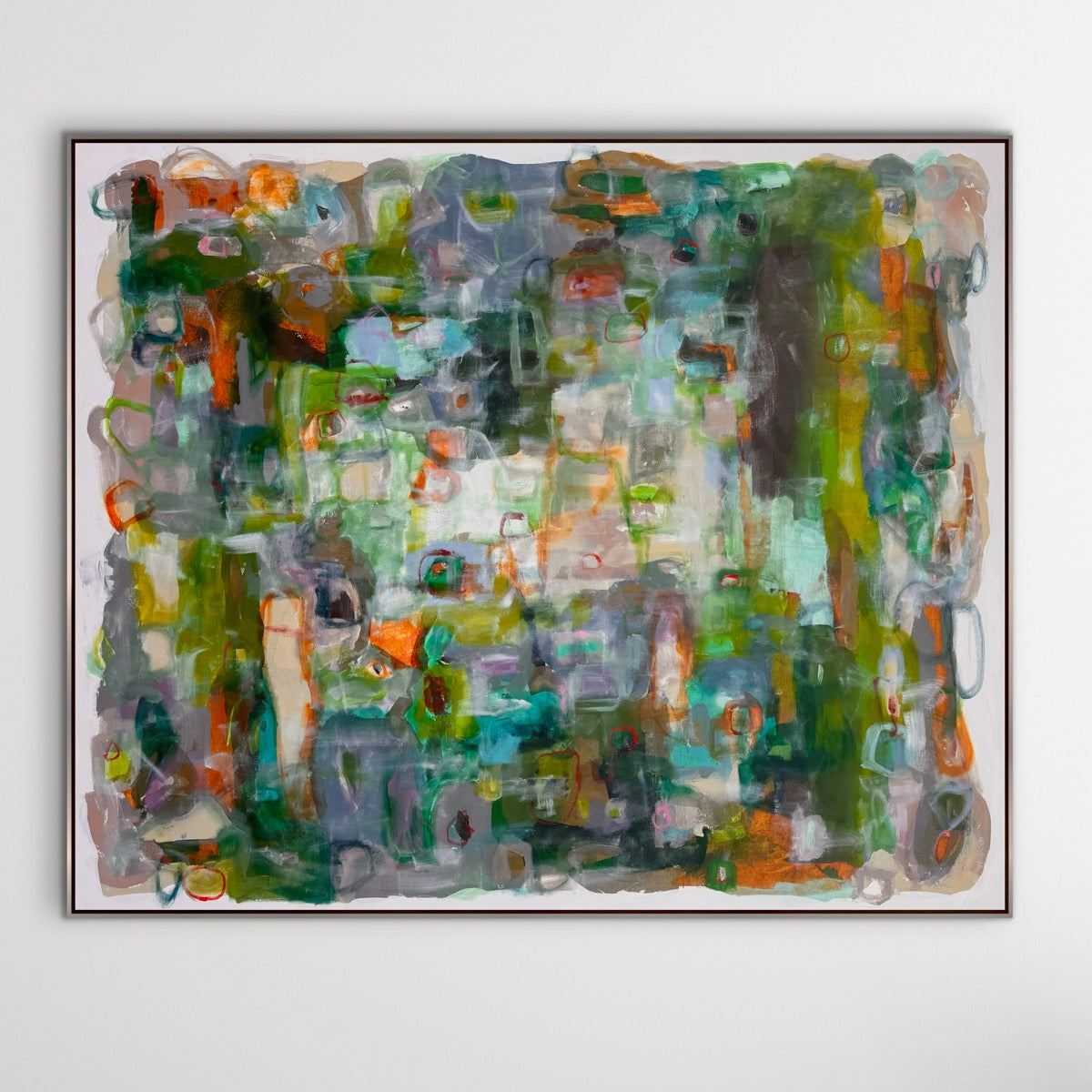 “How Does Your Garden Grow ” is an original abstract expressionist painting in acrylics, on gallery wrapped canvas. It measures 72 x 60 x 1.5”d. There is an optional silverleaf finish wood floating frame or it can come unframed with the sides painted white. It can be oriented horizontally or vertically.