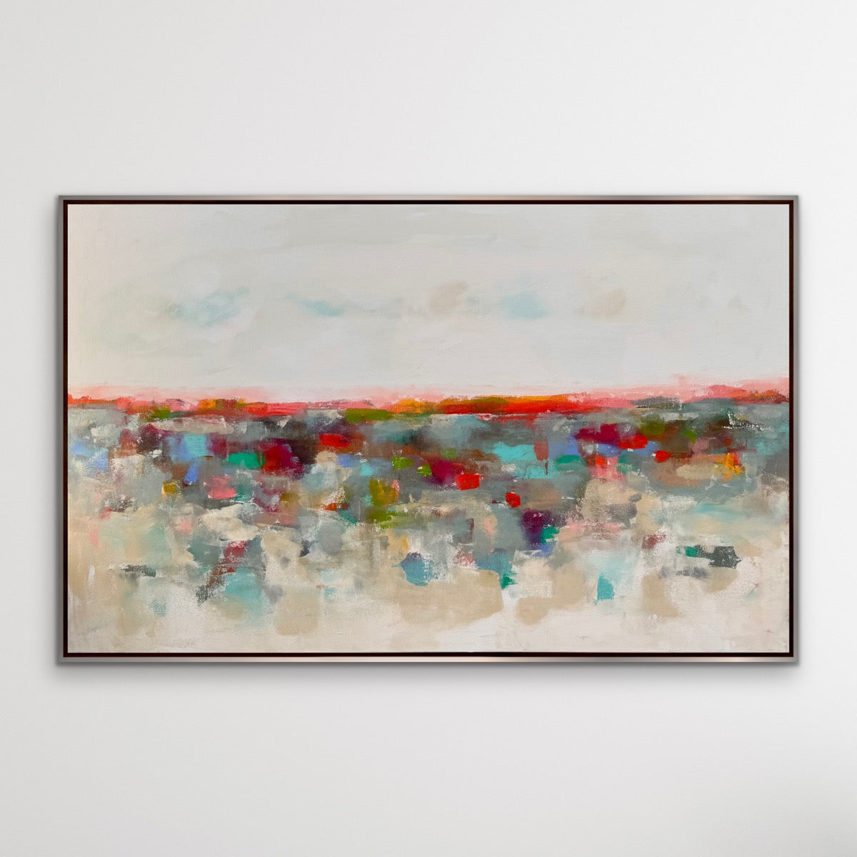 “Mosaic Landscape ” is an original abstract landscape painting in acrylics, on gallery wrapped canvas. It measures 48 x 30 x 1.5”d. There is an optional silver leaf finish wood floating frame or it can come unframed with the sides painted a sand color from the front. Framed the dimensions are 49.5 x 31.5 x 2”d.