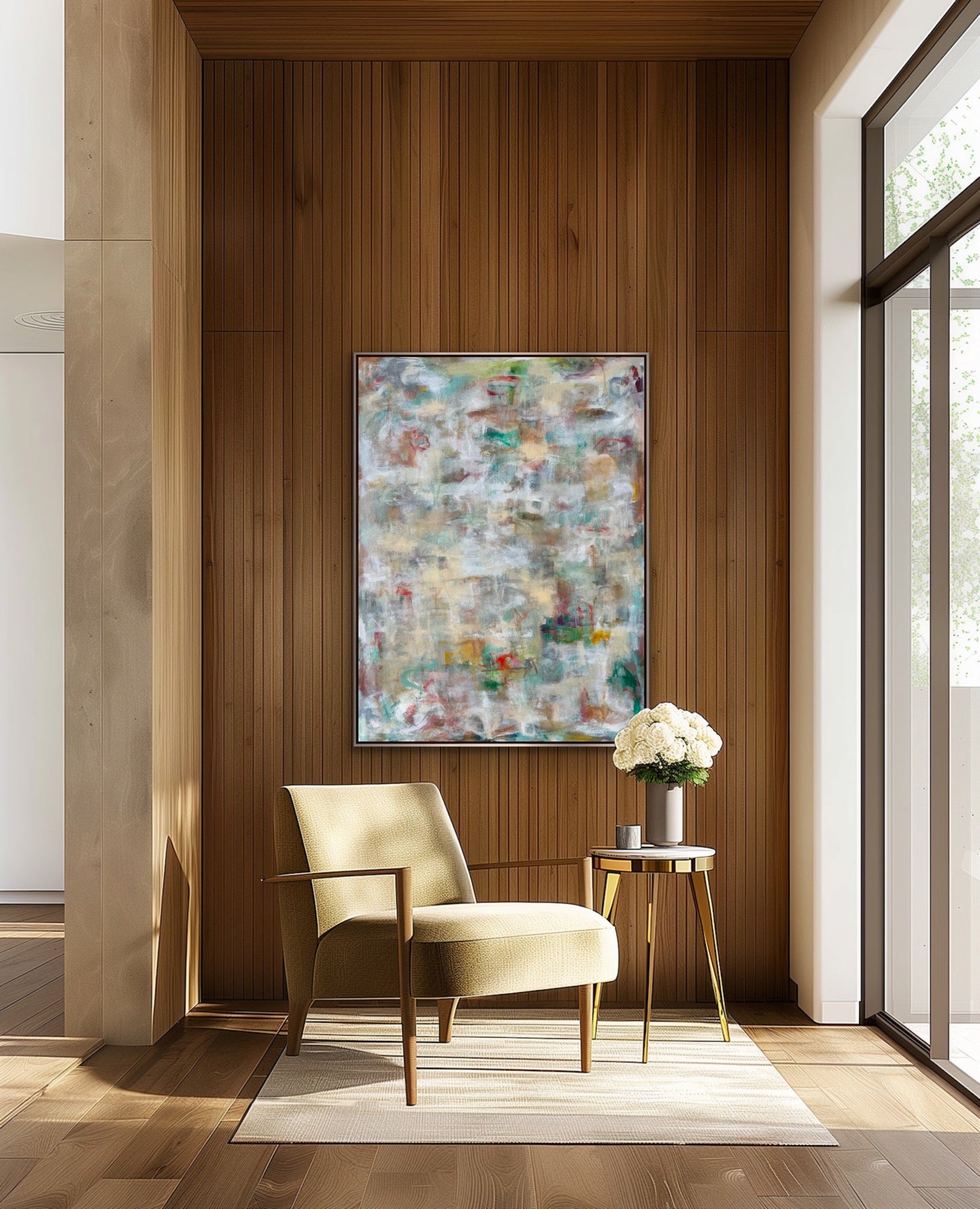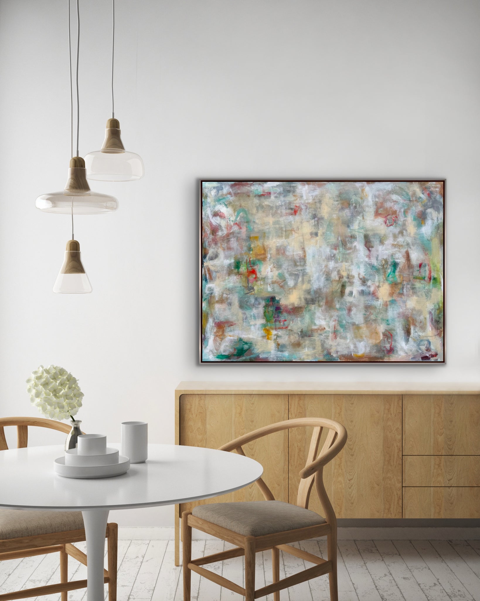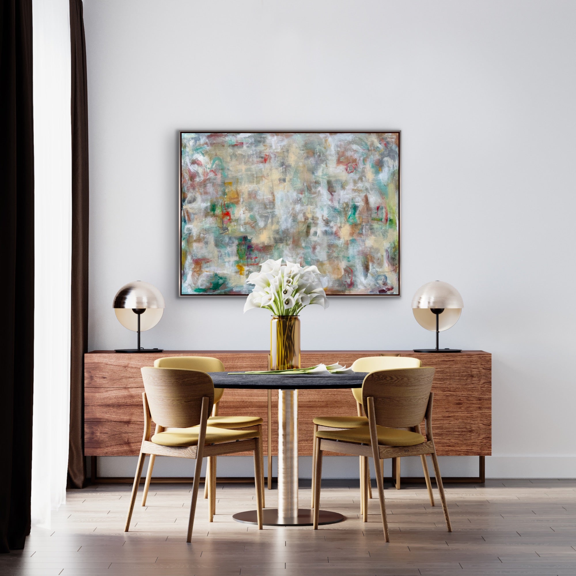 “Nature Walk ” is an original abstract expressionist painting on gallery wrapped canvas. It measures 36 x 48 x 1.5”d. It comes wired and ready to hang and can be oriented horizontally or vertically. The sides are painted white and there is an optional silver leaf finish floating frame available.