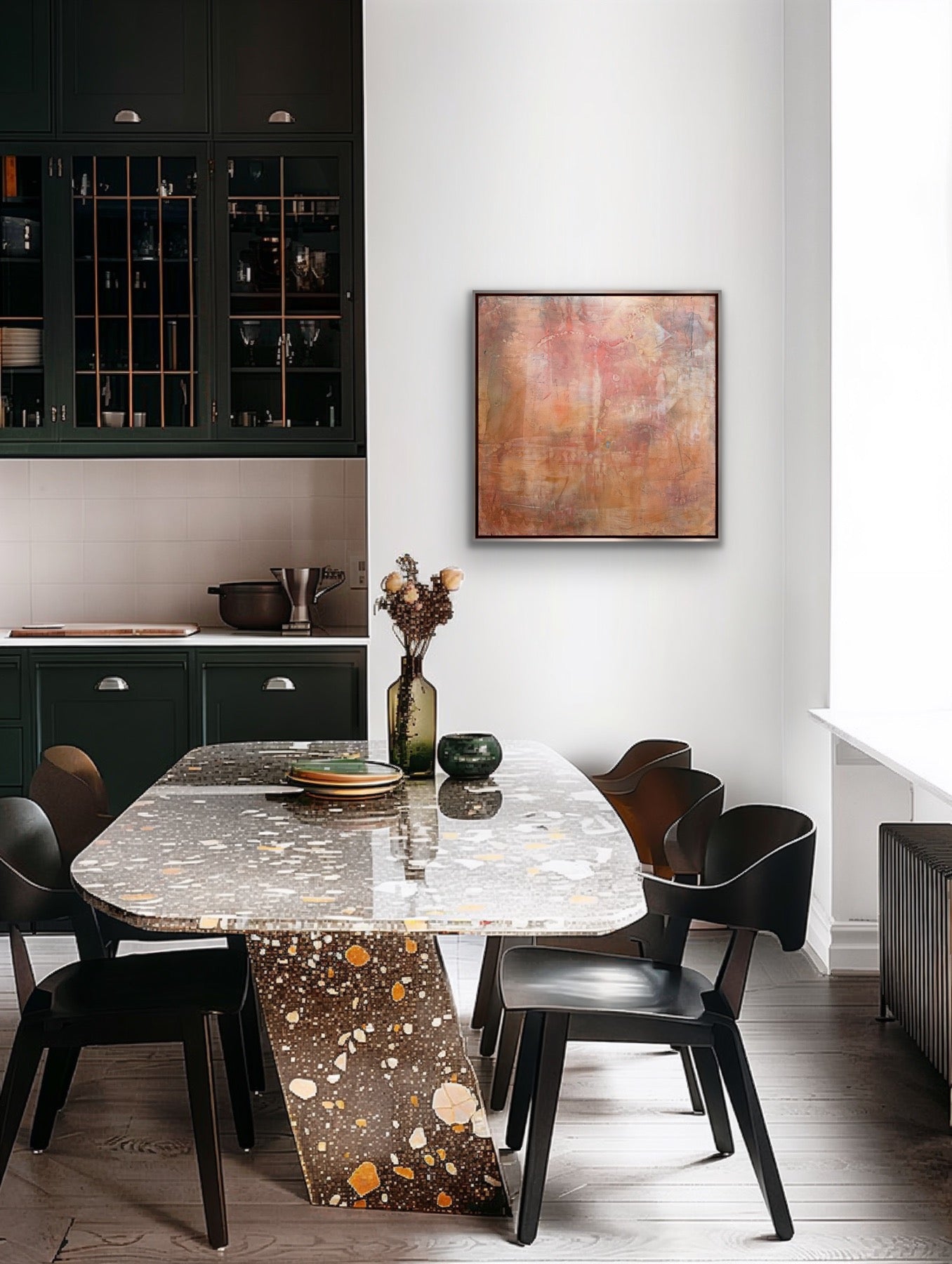 “Pink” is an original abstract painting in Venetian plaster on a birch wood panel. It’s mixed with pigments and acrylic paint in layers, some that have been knocked back to reveal the paint beneath.  Then it’s burnished, sealed in beeswax and hand polished. It has a beautiful, deep shine similar to marble with slight texture variations in the surface. It measures 24 x 24 x 1.5”d and is framed in a silver leaf finish floating frame measuring 25.5 x 25.5 x 2”d that comes wired and ready to hang.