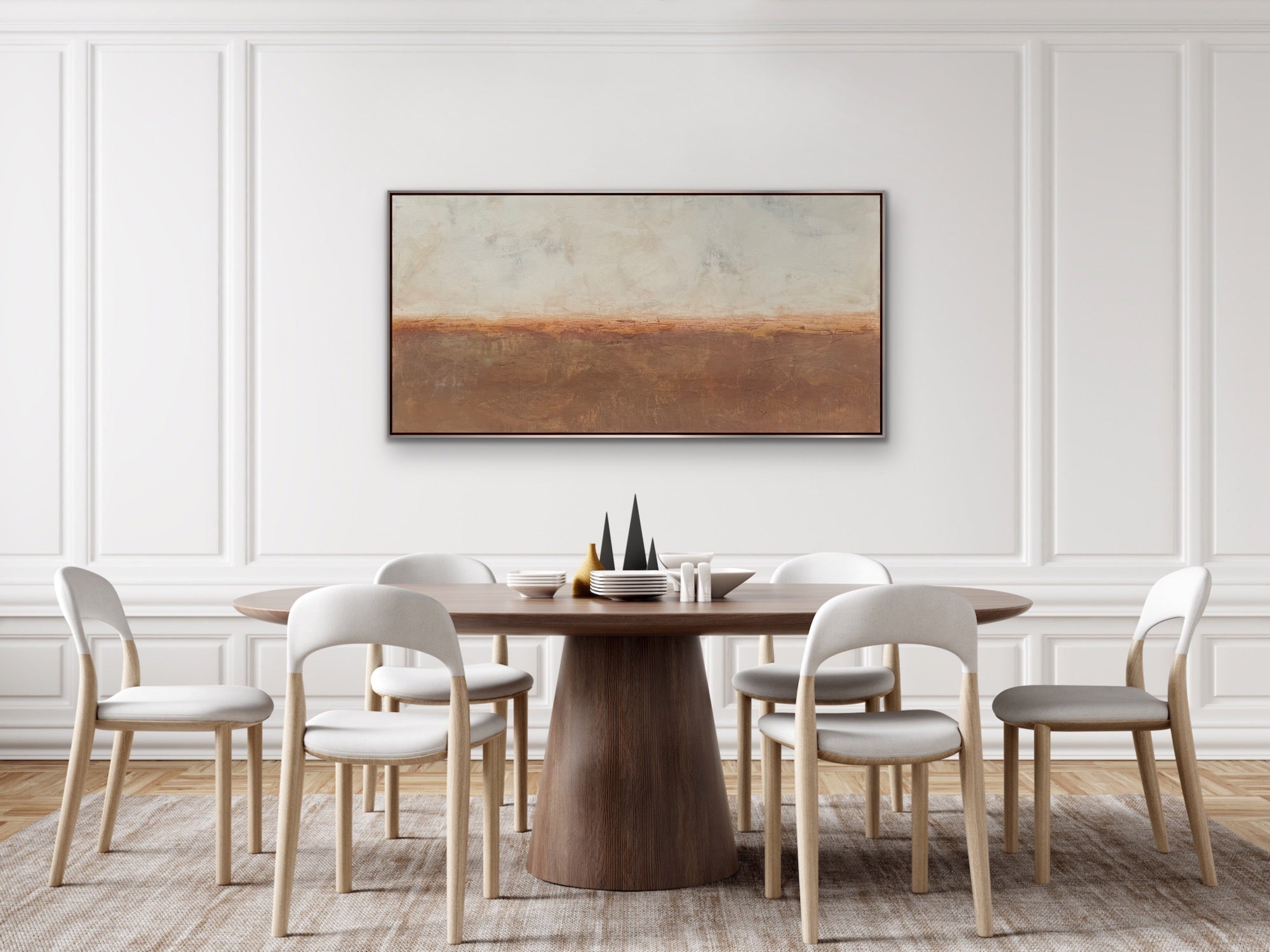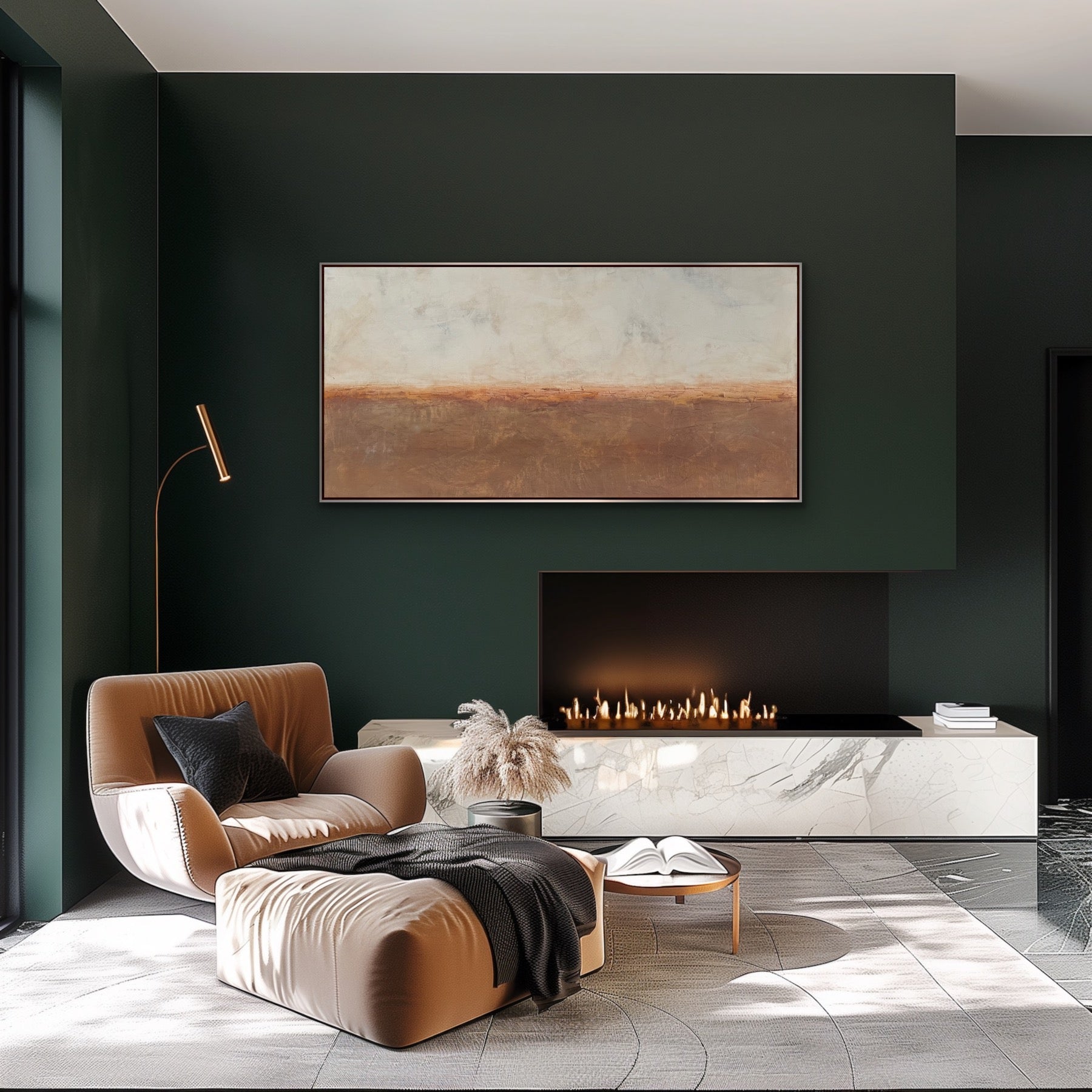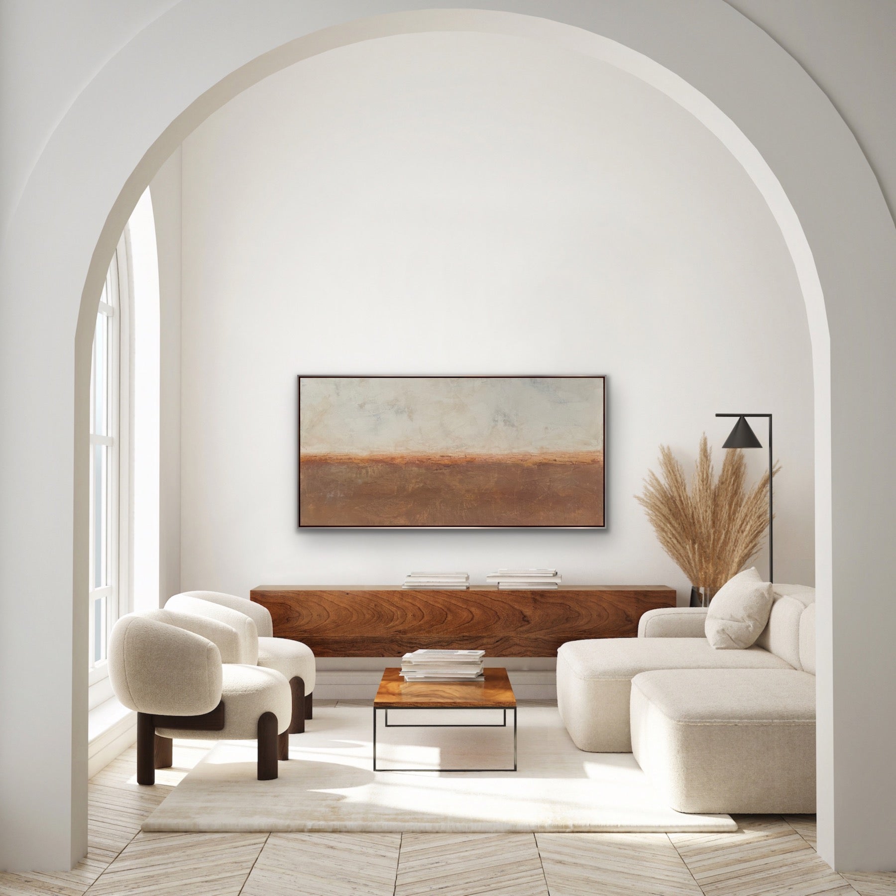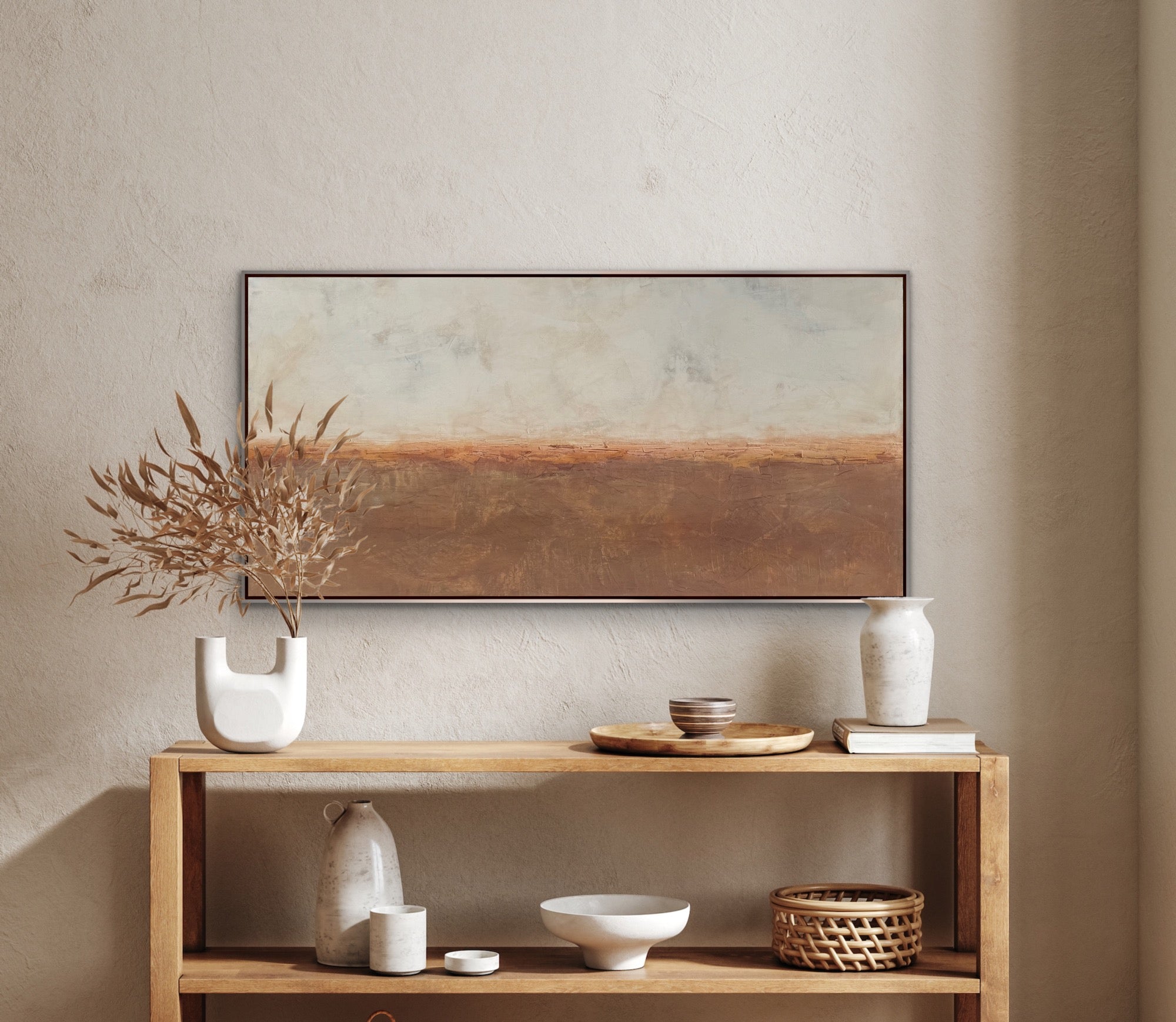 “Quiet Calm” is an original abstract landscape painting in Venetian plaster on a birch wood panel. It’s mixed with raw pigments layered to reveal the paint beneath. It’s then burnished, sealed in beeswax and hand polished. It has a beautiful, deep shine similar to marble with slight texture variations in the surface. It measures 60 x 30 x 1.5”d and is framed in a silver leaf finish floating frame measuring 61.25 x 31.25 x 2”d that comes wired and ready to hang.