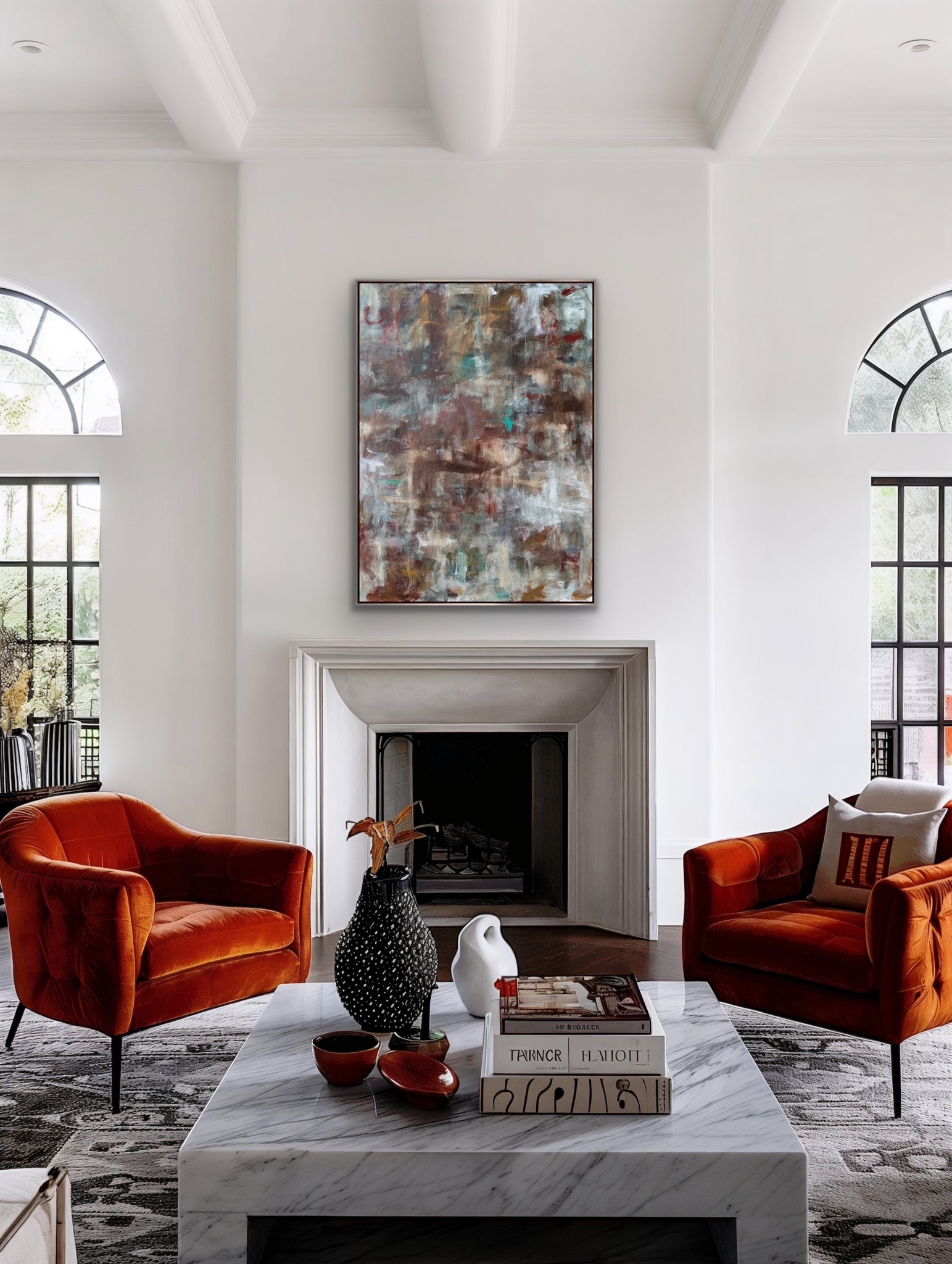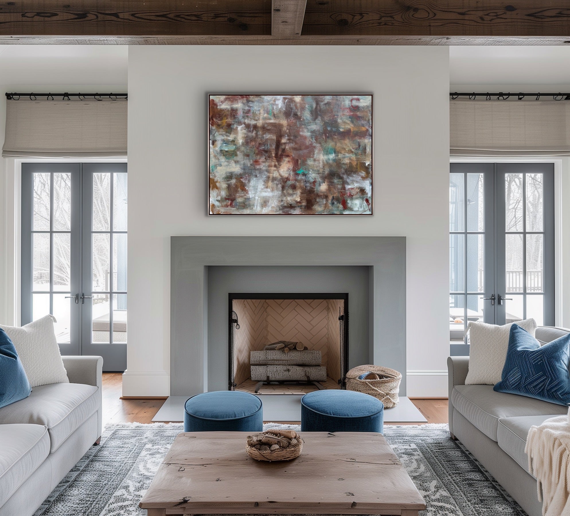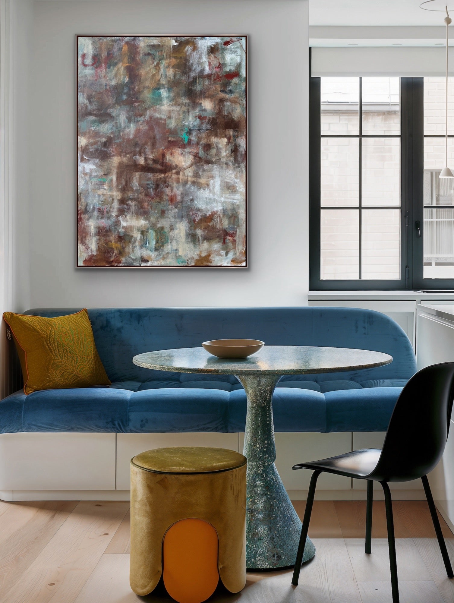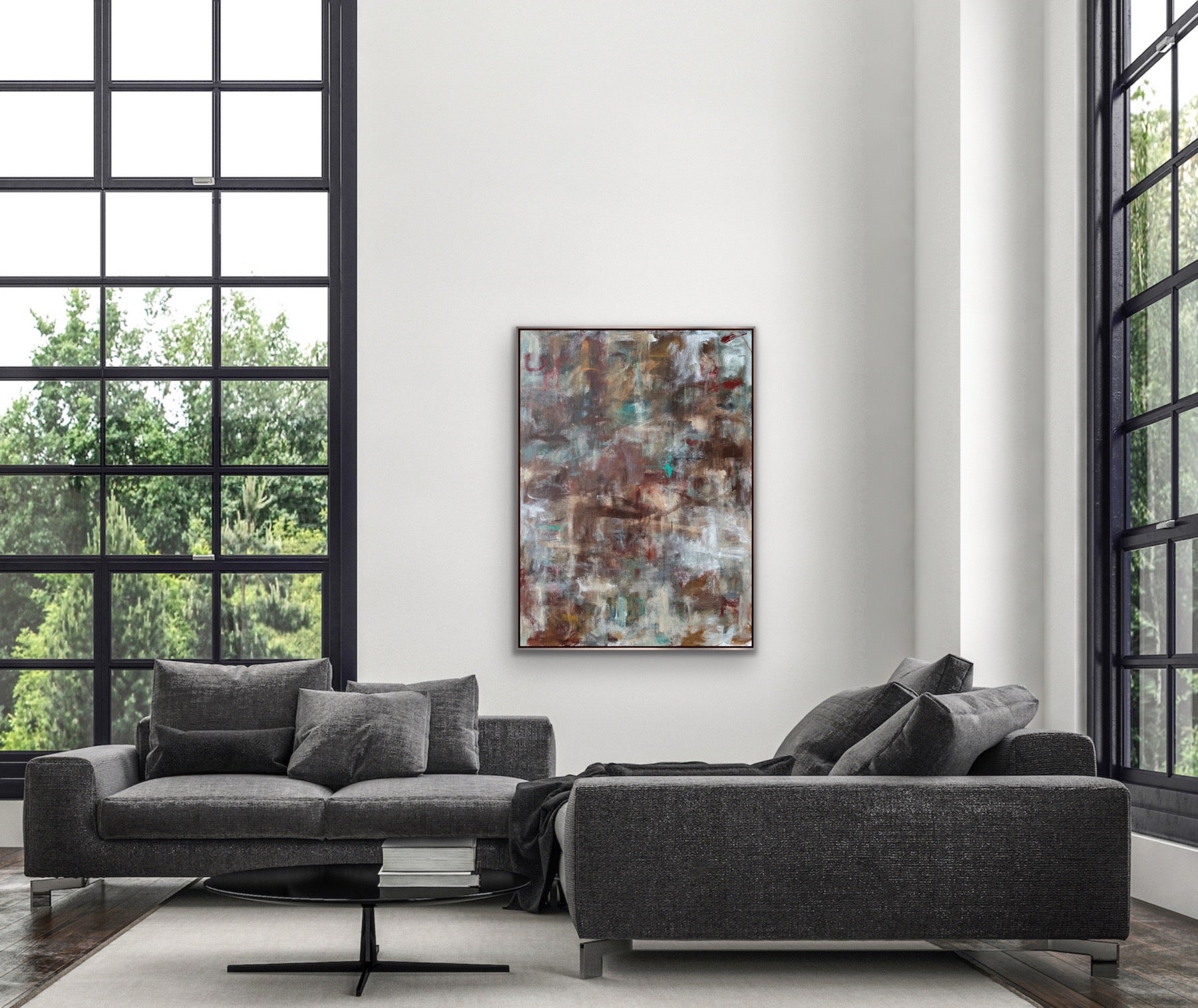 “Cappuccino” is an original abstract expressionist painting on gallery wrapped canvas. It measures 36 x 48 x 1.5”d. It comes wired and ready to hang and can be oriented horizontally or vertically. The sides are painted white and there is an optional silver leaf finish floating frame available measuring 37.25 x 49.25 x 2”d.