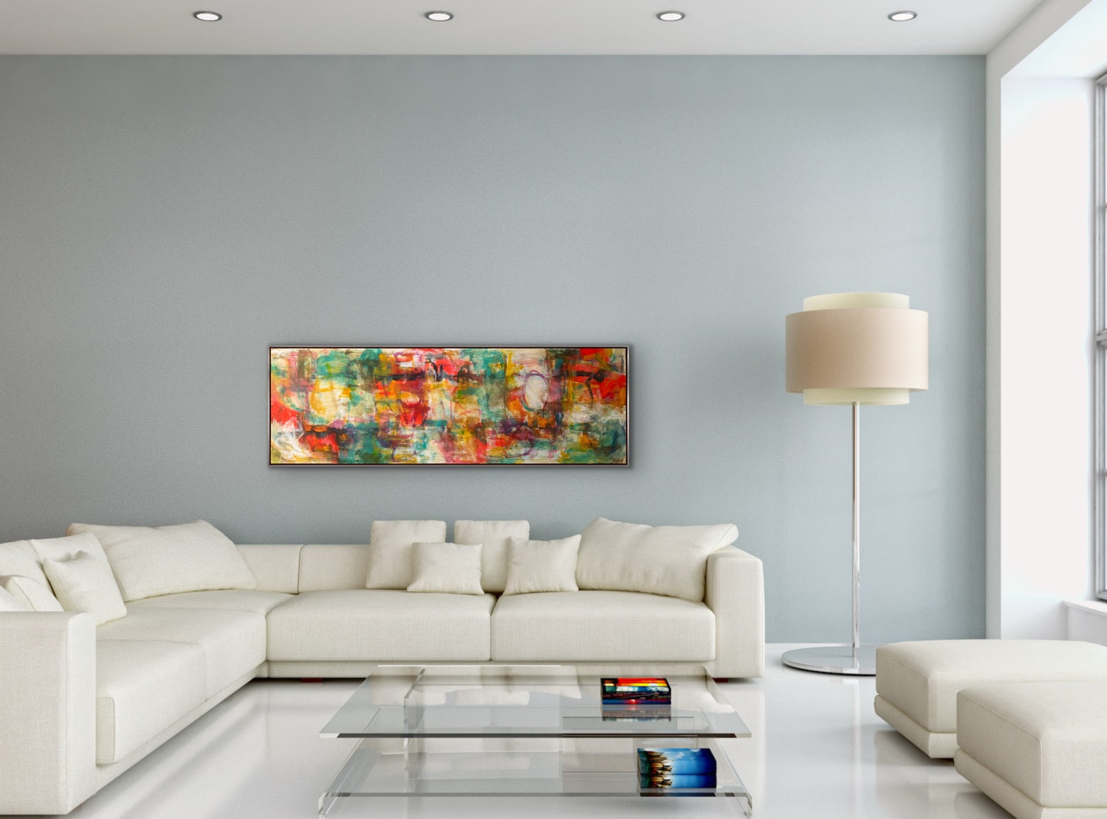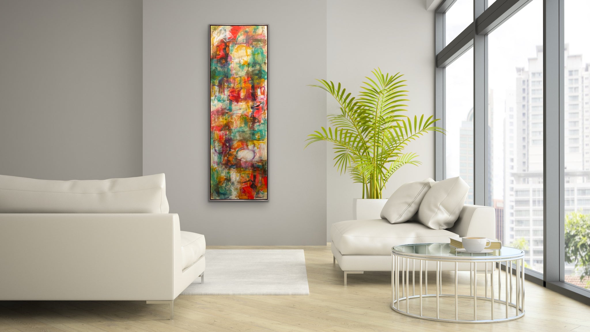 “Color Me Happy” is an original abstract expressionist painting in acrylics, on gallery wrapped canvas. It measure 24 x 72 x 1.5”d. There is an optional silverleaf finish wood floating frame or it can come unframed with the sides painted a light sand color from the front. It can be oriented horizontally or vertically.