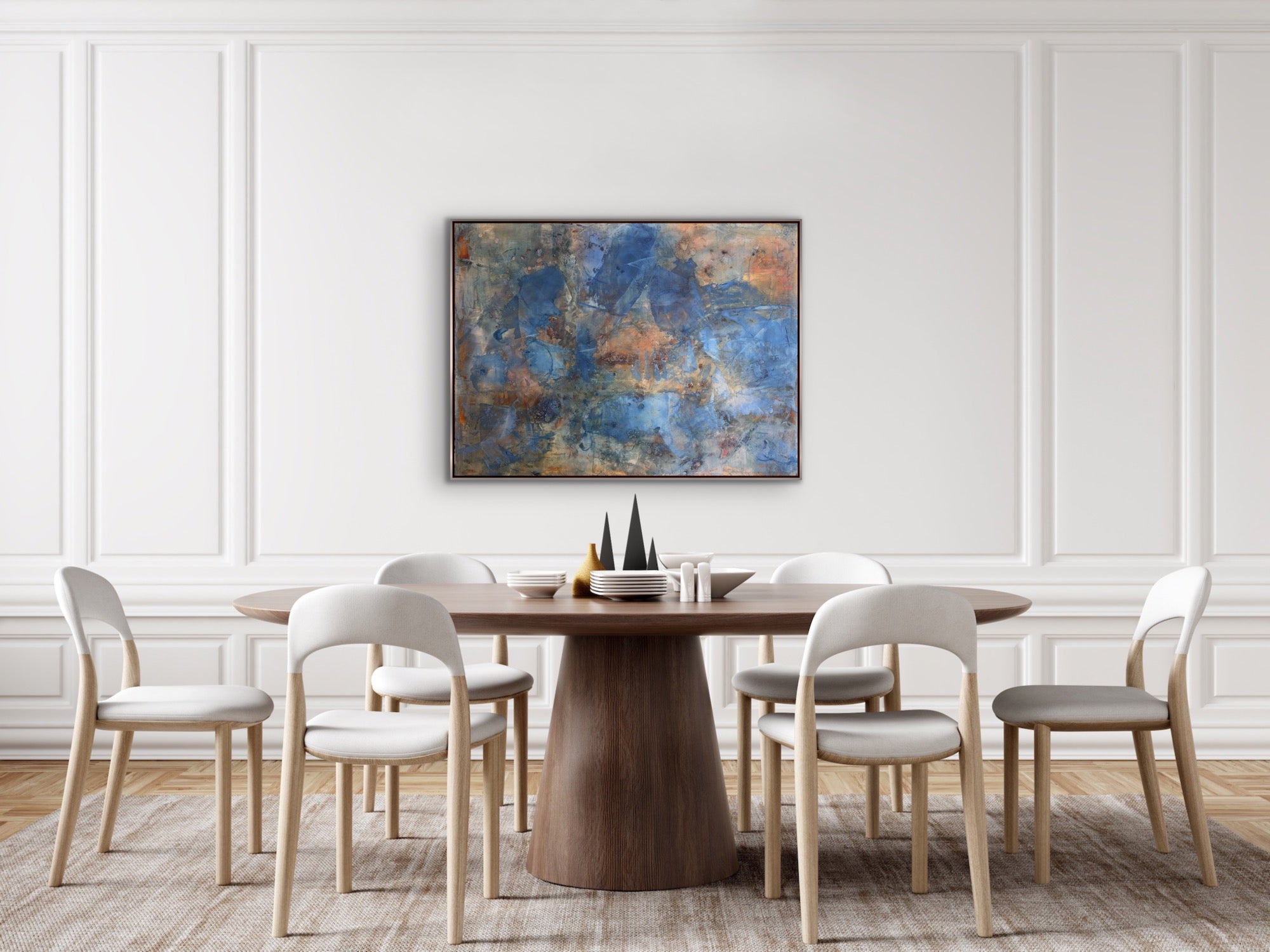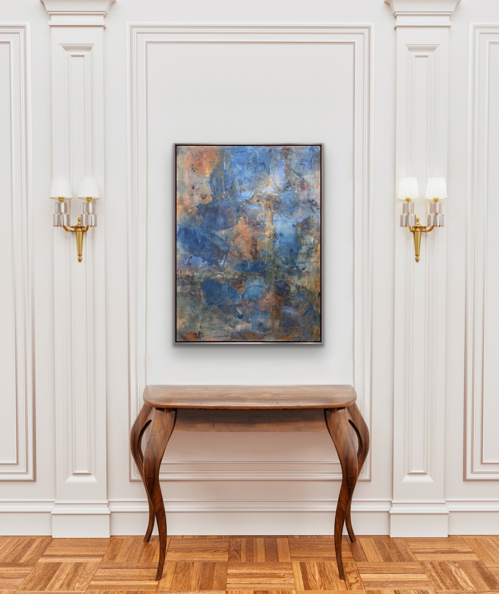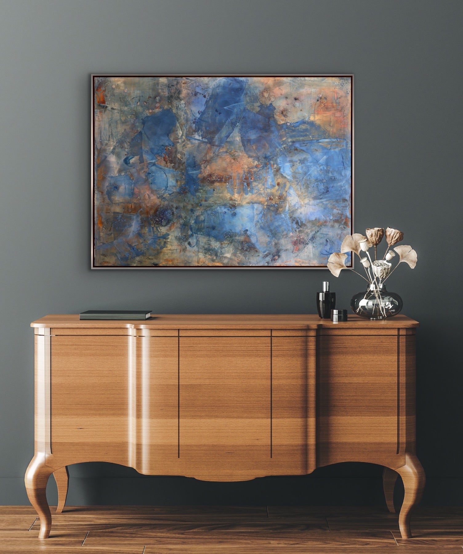 “Estero” is an original abstract painting in Venetian plaster on a birch wood panel. It’s mixed with pigments and acrylic paint in layers, some that have been knocked back to reveal the paint beneath. Then it’s burnished, sealed in beeswax and hand polished. It has a beautiful, deep shine similar to marble with slight texture variations in the surface. It measures 36 x 48 x 1.5”d and is framed in a silver leaf finish floating frame measuring 37.5 x 49.5 x 2”d that comes wired and ready to hang.