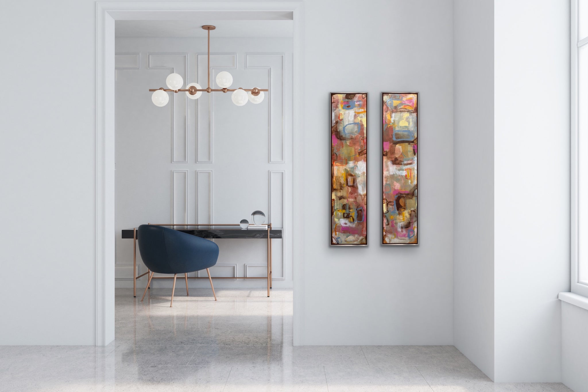 “Callback ” is a set of two original abstract expressionist paintings in acrylics, on gallery wrapped canvas. Each painting measures 12w x 48h x 1.5”d. There is an optional silverleaf finish wood floating frame or they can come unframed with the sides painted brown . With the frame each measures 13.25 x 49.25 x 2”d.