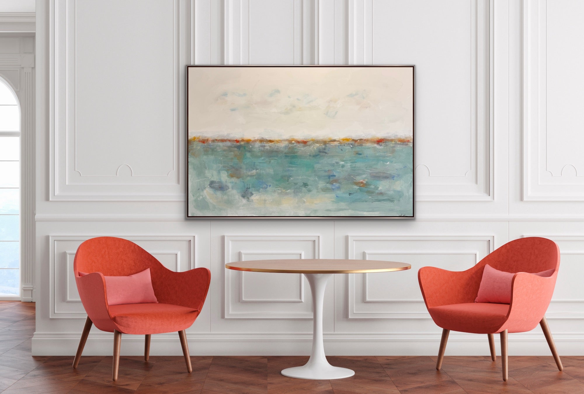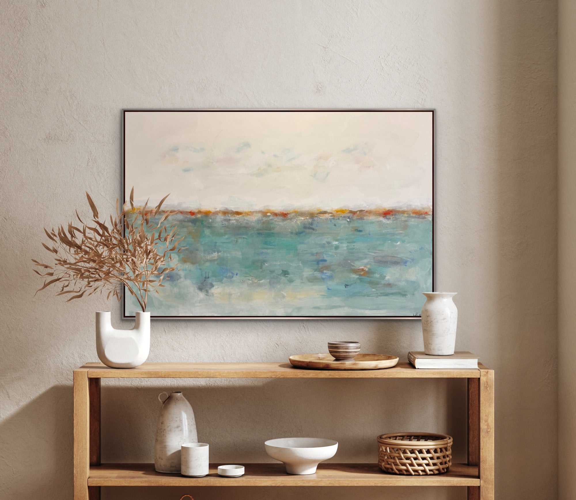 “Wishing Sea” is an original abstract seascape/landscape painting in acrylics, on gallery wrapped canvas. It measures 60 x 40 x 1.5”d. There is an optional silverleaf finish wood floating frame measuring 61.25 x 41.25 x 2”d or it can come unframed with the sides painted to match the front. .