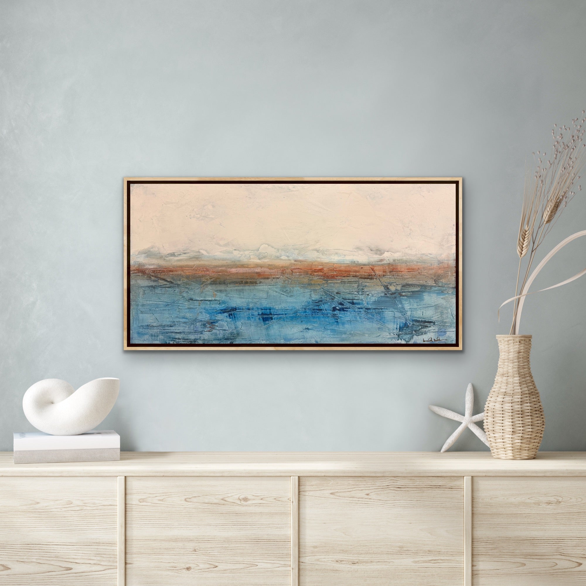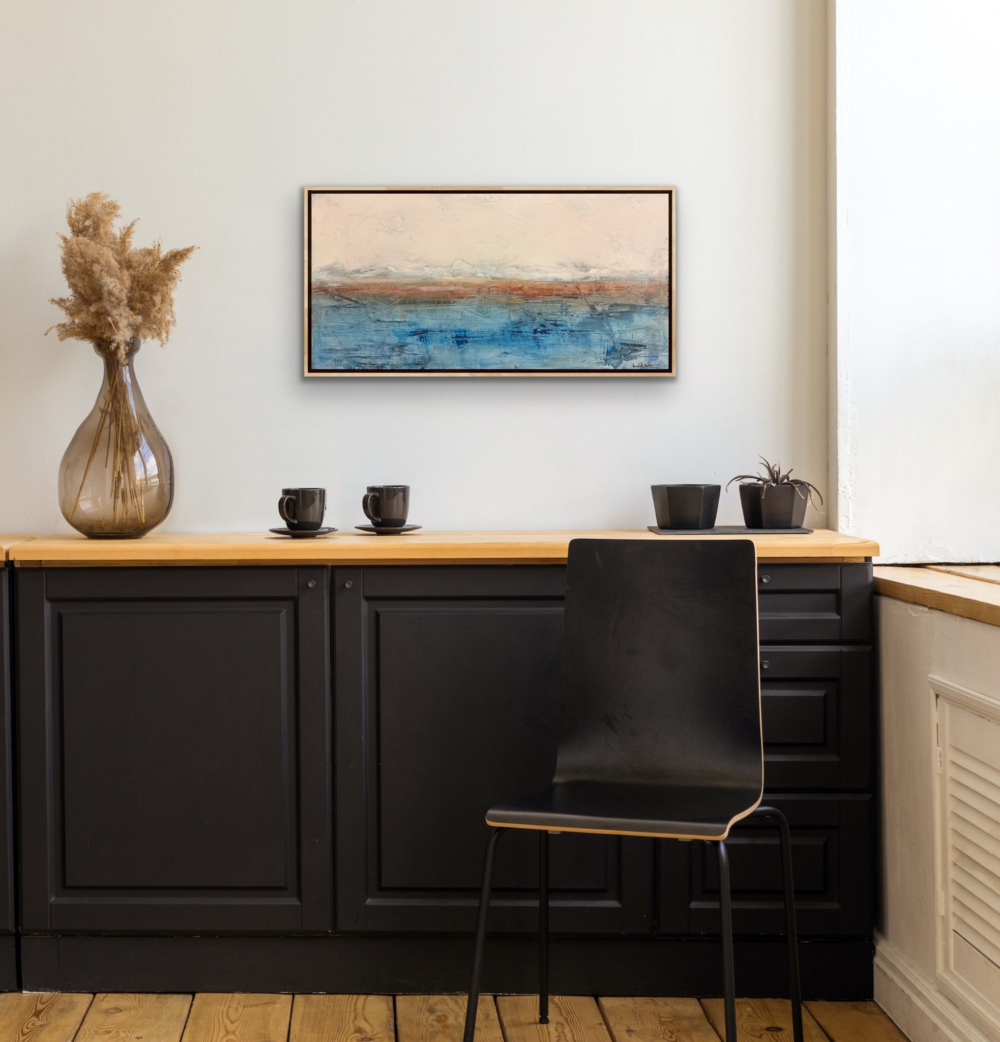 “Copper Sunset ” is an original abstract painting in Venetian plaster on a birch wood panel. It’s mixed with pigments and acrylic paint in layers, some that have been knocked back to reveal the paint beneath. There is metallic copper in the horizon. It’s burnished, sealed in beeswax and hand polished. It has a beautiful, deep shine similar to marble with slight texture variations in the surface. It measures 16 x 31 x 2”d and is framed in a white oak floating frame that comes wired and ready to hang.