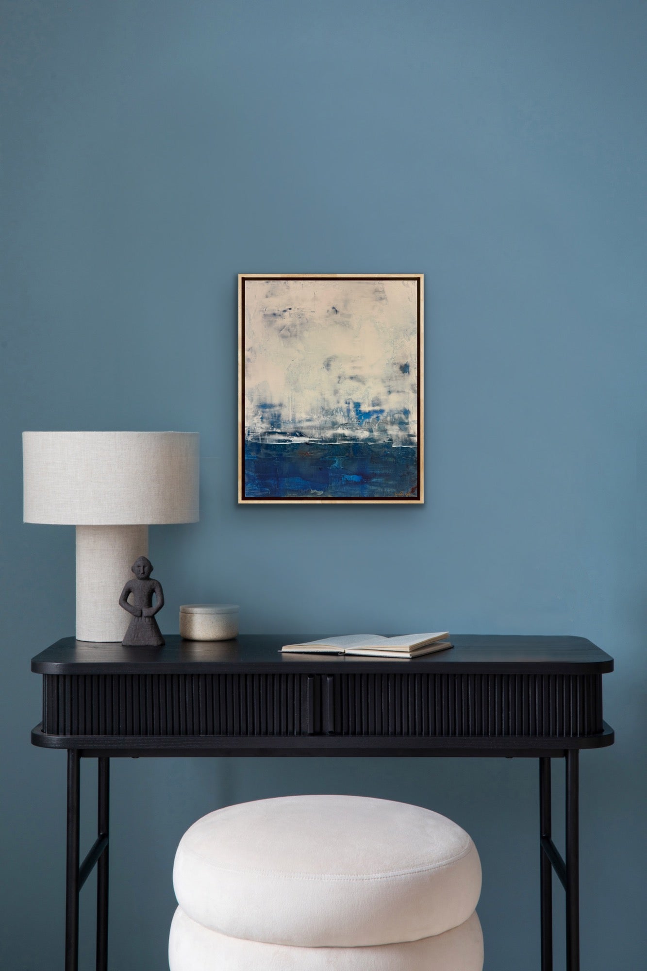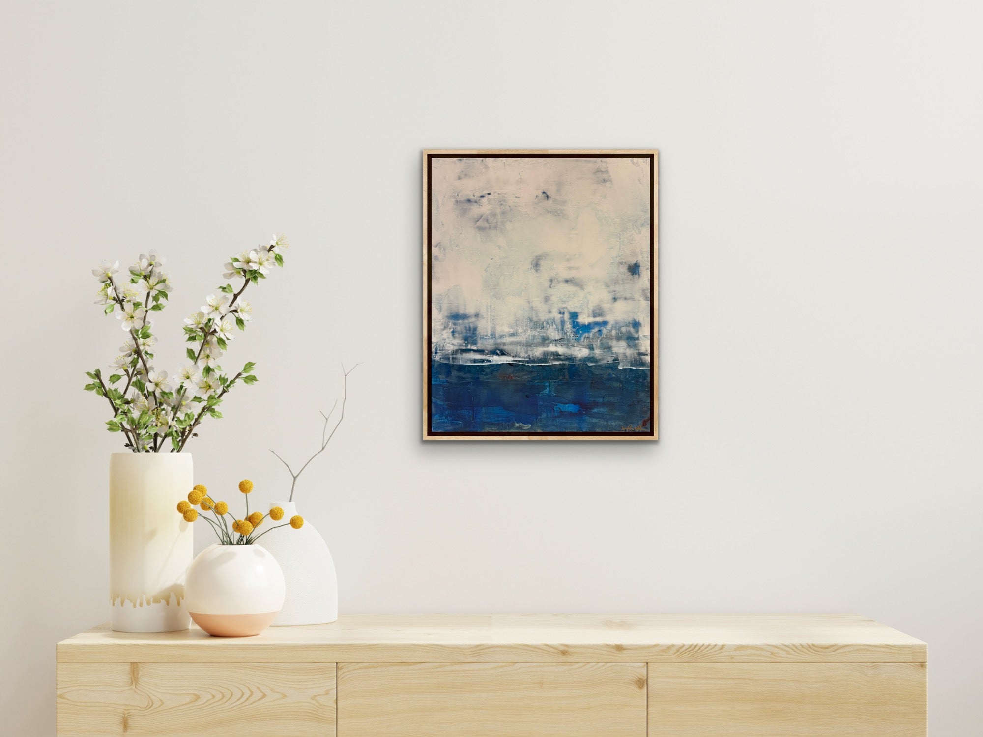 “Veiled Sea” is an original abstract painting in Venetian plaster on a birch wood panel. It’s mixed with pigments and acrylic paint in layers, some that have been knocked back to reveal the paint beneath. Then it’s burnished, sealed in beeswax and hand polished. It has a beautiful, deep shine similar to marble with slight texture variations in the surface. It measures 16 x 20 x 1.5”d and is framed in a white oak floating frame measuring 17.5 x 21.5 x 2”d that comes wired and ready to hang.
