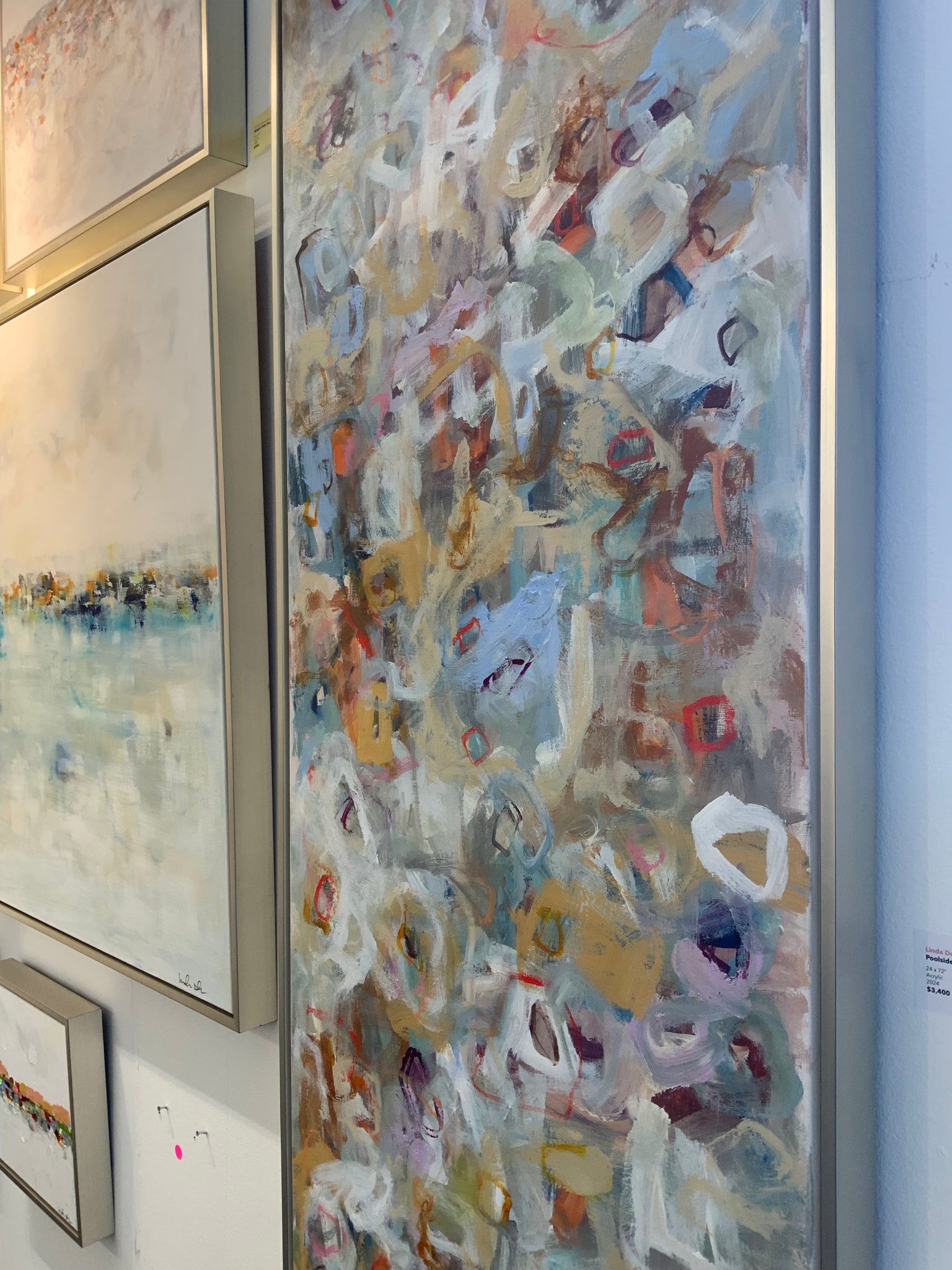 “Poolside” is an original abstract expressionist painting in acrylics, on gallery wrapped canvas. It measure 24 x 72 x 1.5”d. There is an optional silverleaf finish wood floating frame or it can come unframed with the sides painted a light sand color from the front. It can be oriented horizontally or vertically.